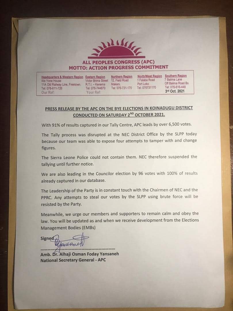 Sierra Leone main opposition All People’s Congress (APC) party has revealed the results of Koinadugu District bye-elections and accused the ruling Sierra Leone Peoples Party (SLPP) of disrupting the process.
