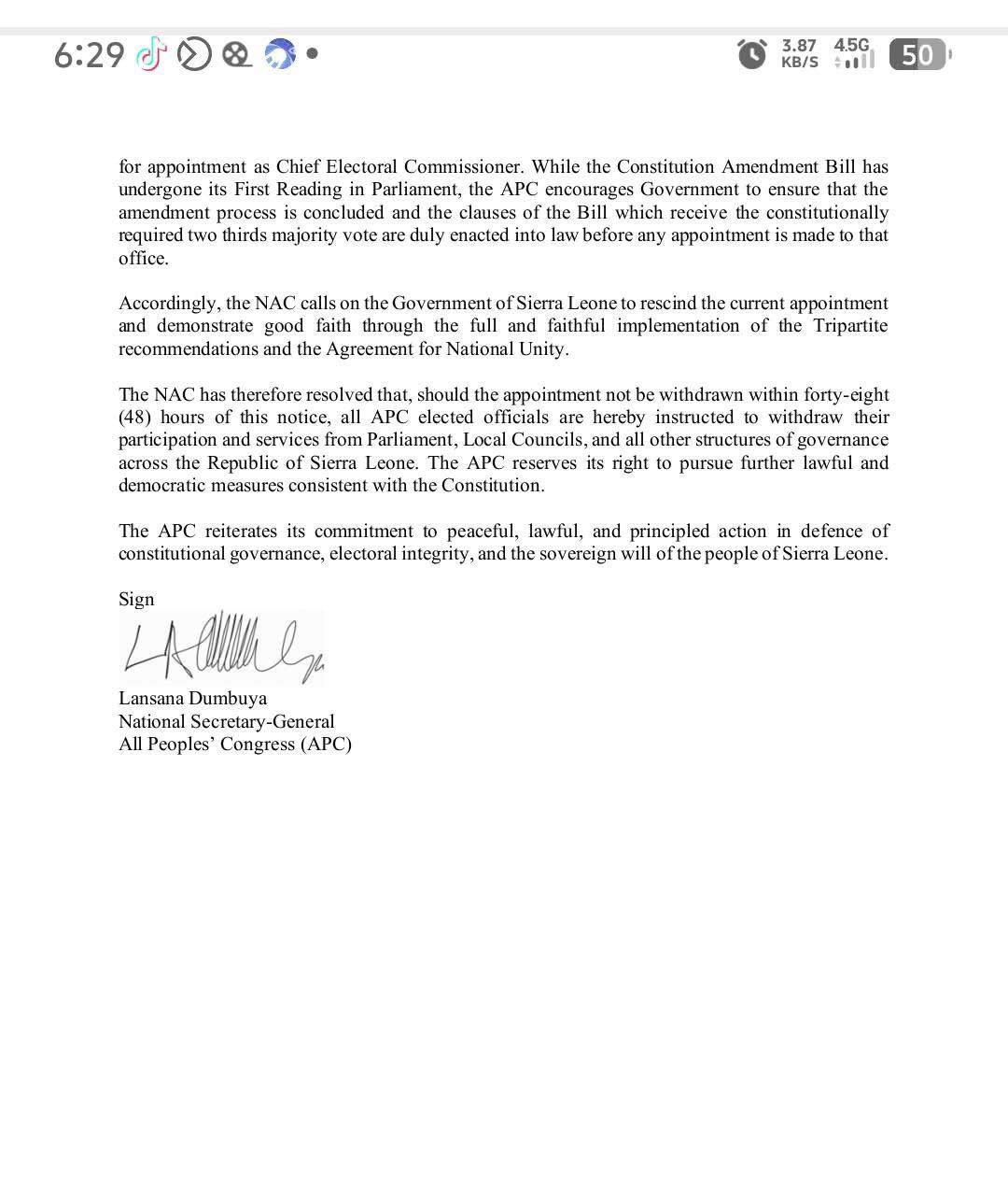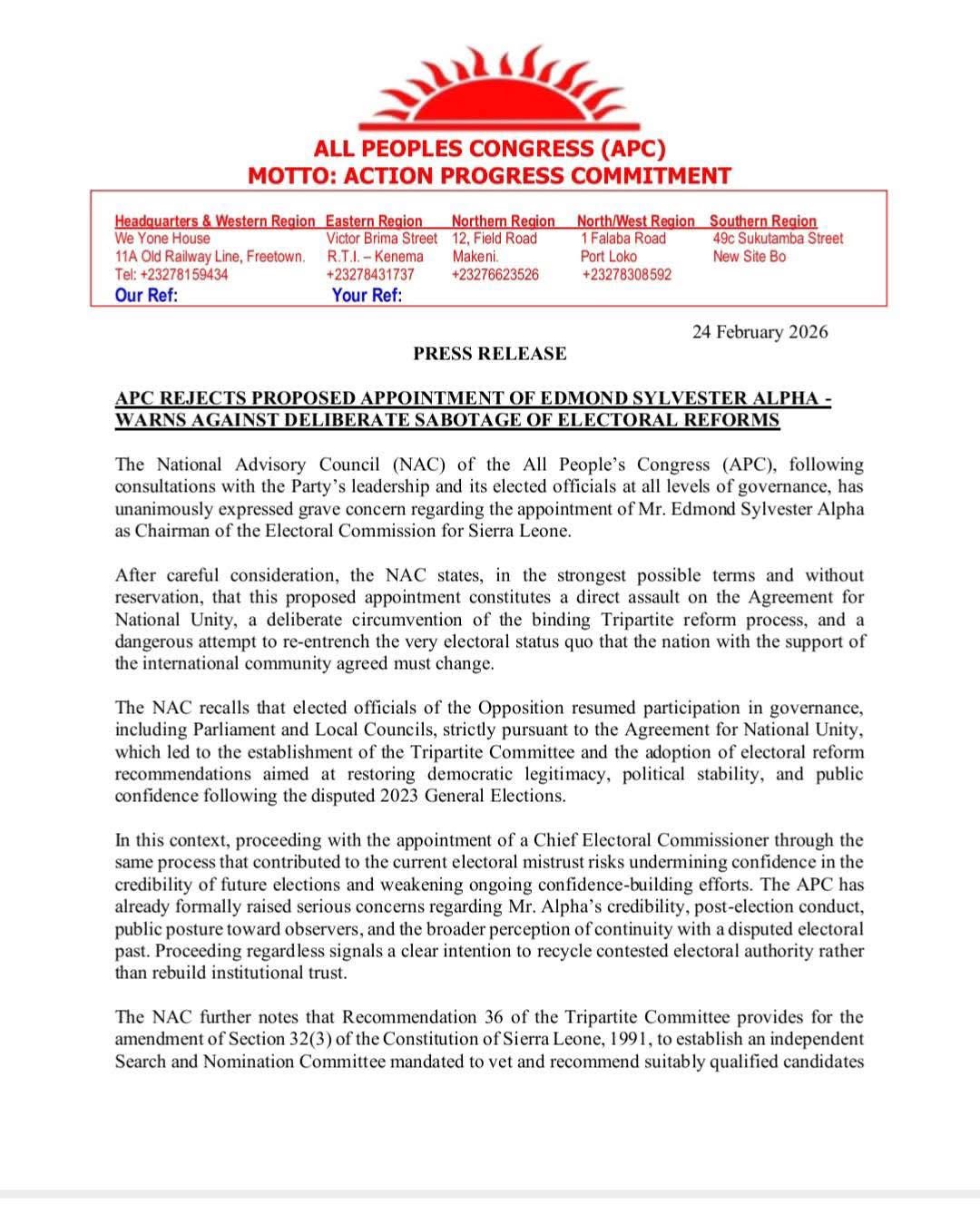 The statement, signed by APC National Secretary-General Lansana Dumbuya, said the proposed appointment risks undermining ongoing electoral reforms and confidence-building efforts following the disputed 2023 General Elections.