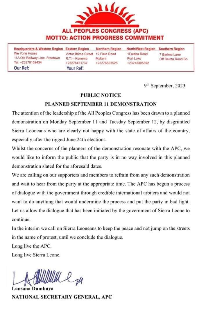 In light of growing rumors surrounding planned demonstrations scheduled for September 11 and 12, 2023, the All Peoples Congress (APC), the main opposition political party in Sierra Leone, has issued an official statement, urging its supporters and members to abstain from participating in these protests.