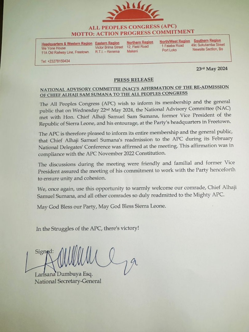 The National Advisory Committee (NAC) of the main opposition All People’s Congress (APC) has officially affirmed the re-admission of Chief Alhaji Sam Sumana to the party. The announcement was made in a press release dated May 23, 2024.