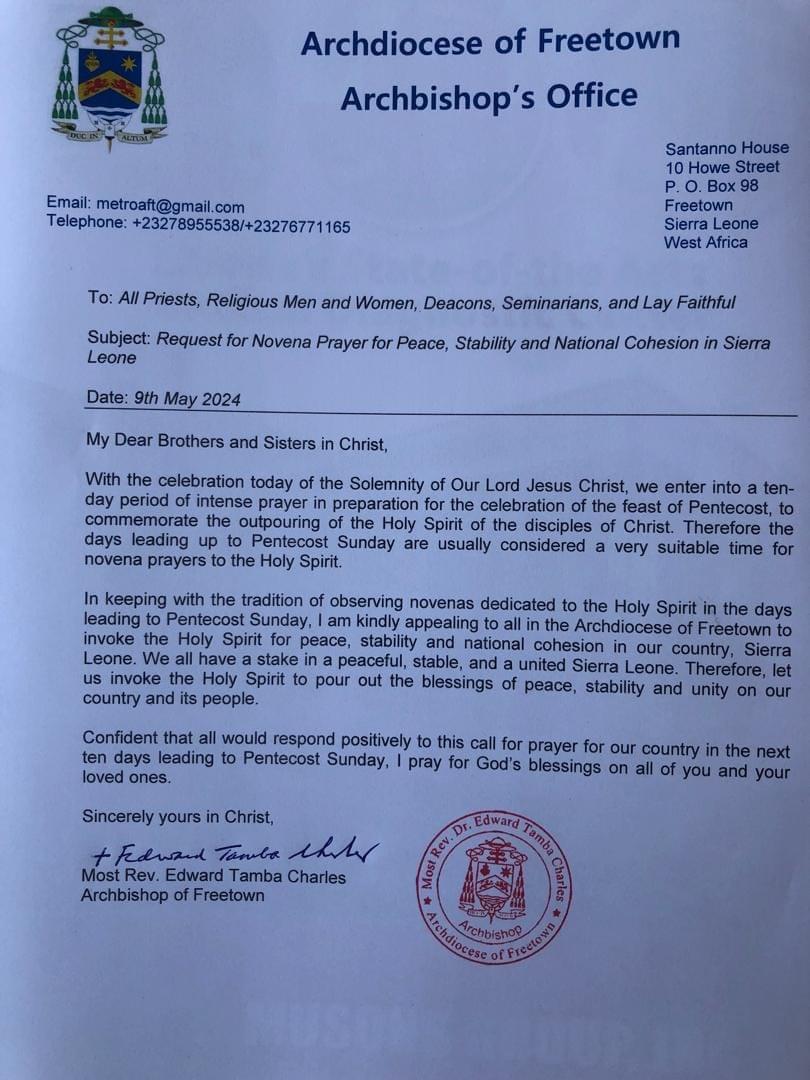 The Archbishop Office of Sierra Leone has in a letter dated 9th May 2024 requested for a ten days Novena prayer for peace, stability, and National Cohesion in Sierra Leone.
