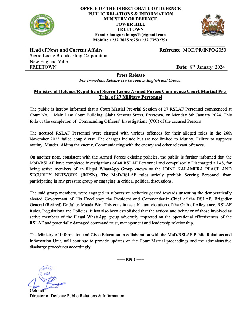 In a press statement released January 8th, 2024, the Office of the Directorate of Defence Public Relations & Information, Ministry of Defence, has informed the public about the commencement of a Court Martial Pre-trial Session for 27 personnel of the Republic of Sierra Leone Armed Forces (RSLAF).