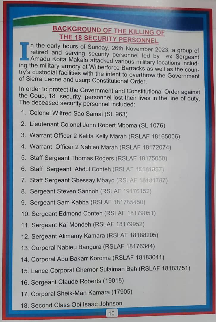 The attacks, aimed at overthrowing the Government and usurping the Constitutional Order, resulted in the deaths of 18 security personnel. The deceased included high-ranking officers such as Colonel Wilfred Sao Samai (SL 963) and Lieutenant Colonel John Robert Mboma (SL 1076), as well as junior ranks up to Lance Corporal and Private.
