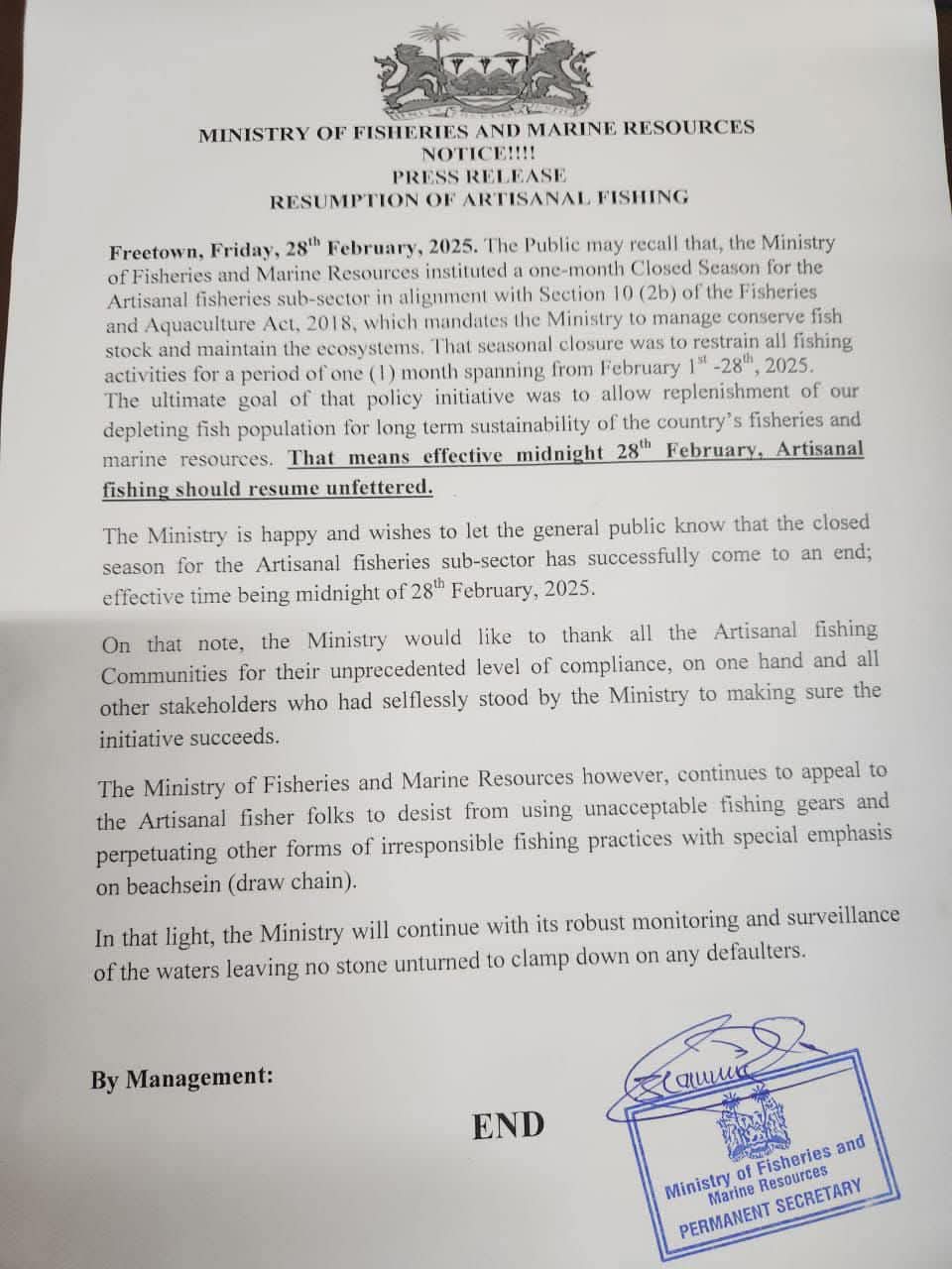 The government of Sierra leone through the ministry of Fisheries and Marine Resources has announced the successful end of the one-month closed season for artisanal fishing, which began on February 1st.
