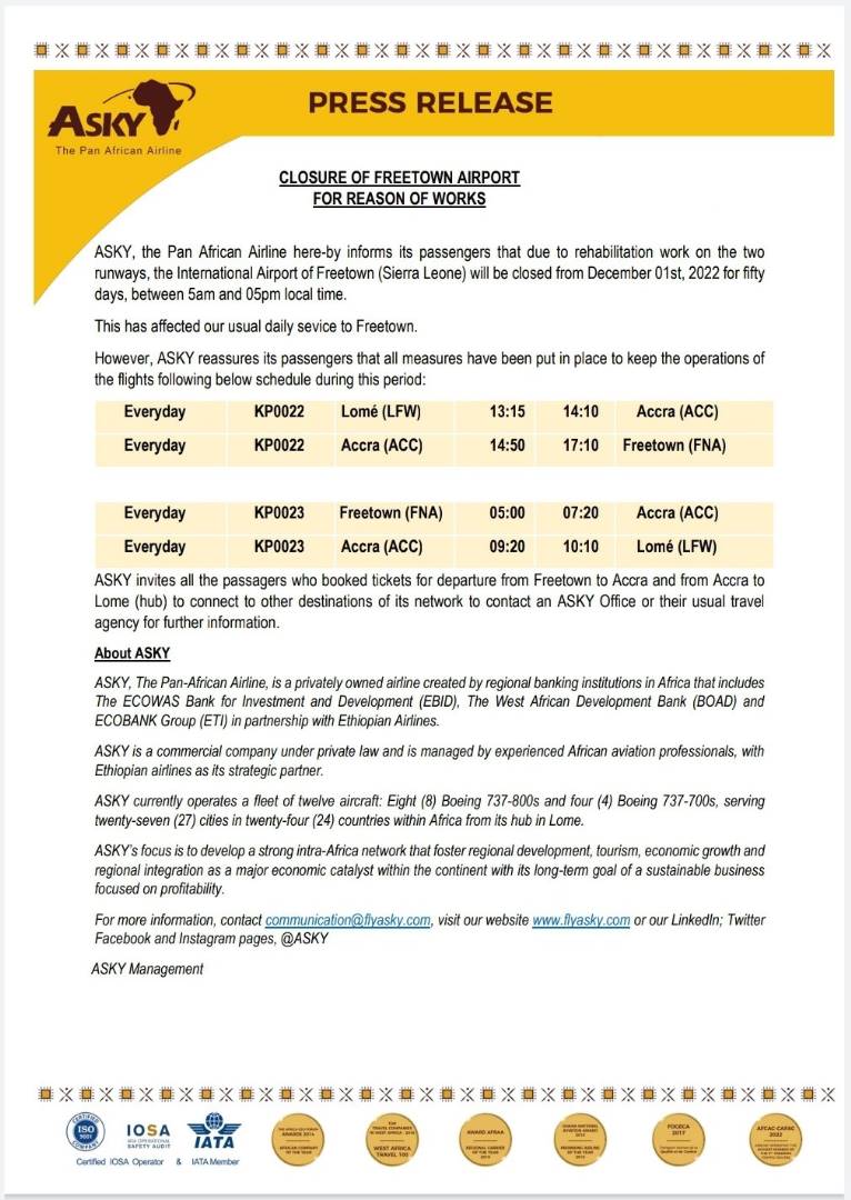 The leading Pan-African Airline set up at the initiative of West & Central African governments, ASKY, has announced a temporal shutdown of the international Airport of Freetown, due to rehabilitation works on the two runways.
