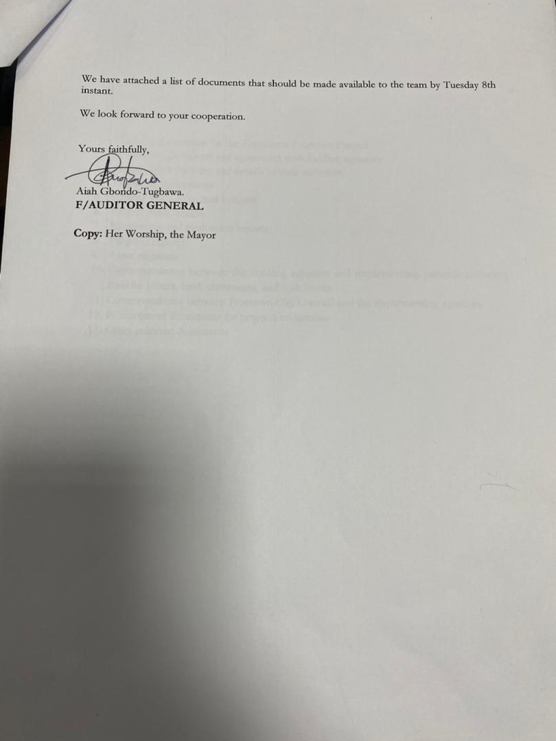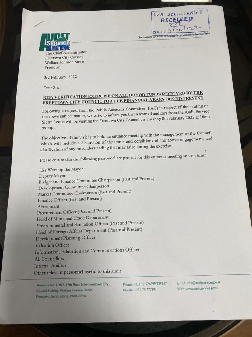 According to the letter, the Audit Service Sierra Leone will visit the Freetown City Council on Tuesday the 8th February 2022.