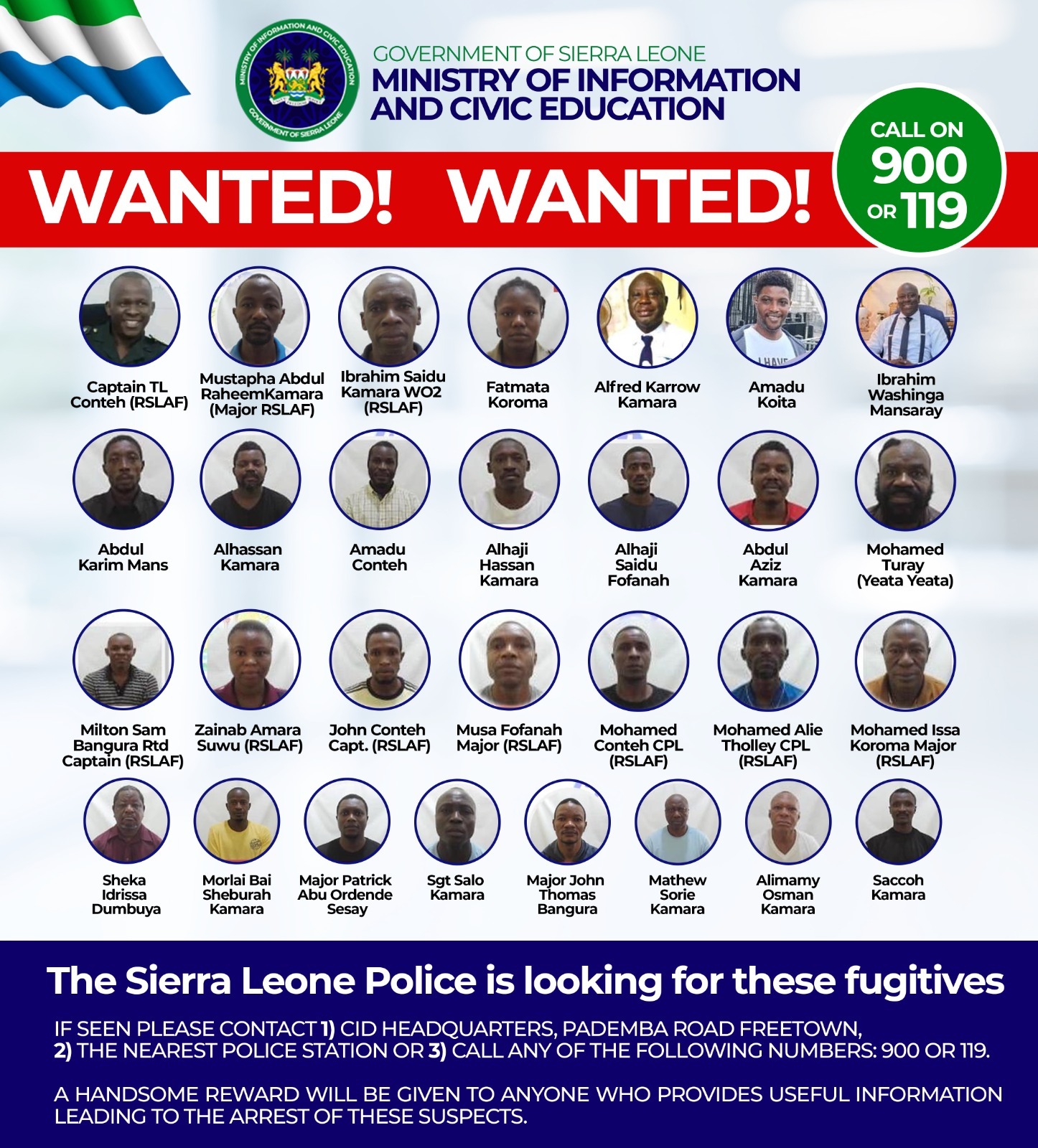 The Sierra Leone government, through the Ministry of Information and Civic Education and in collaboration with the Sierra Leone Police, has released a verified list of 29 individuals wanted in connection with the failed coup attempt that occurred on November 26th in Freetown.