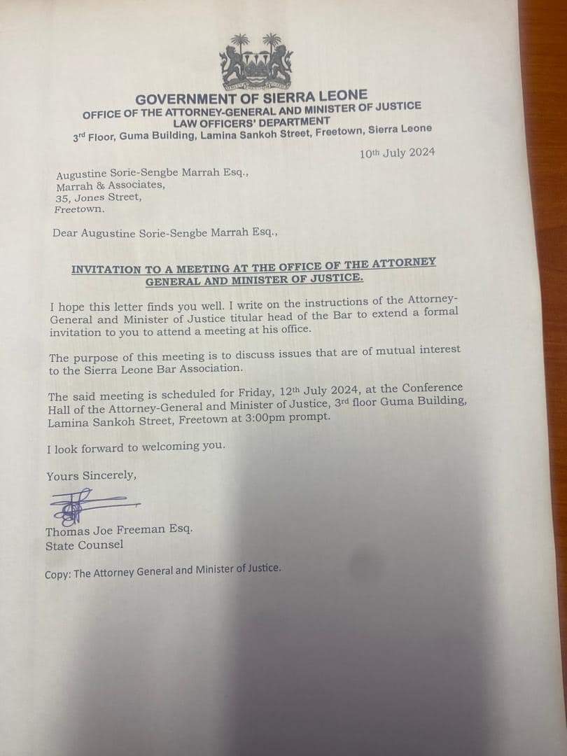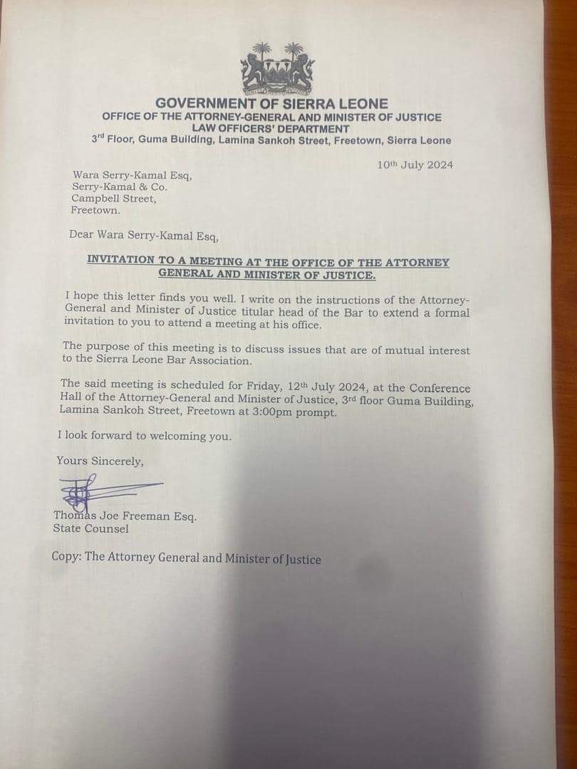 The Attorney General and Minister of Justice has extended a formal invitation to the aggrieved Bar Association presidential aspirants, Augustine Sorie-Sengbe Marrah and Wara Serry-Kamal, for a meeting to discuss pressing issues within the Sierra Leone Bar Association.