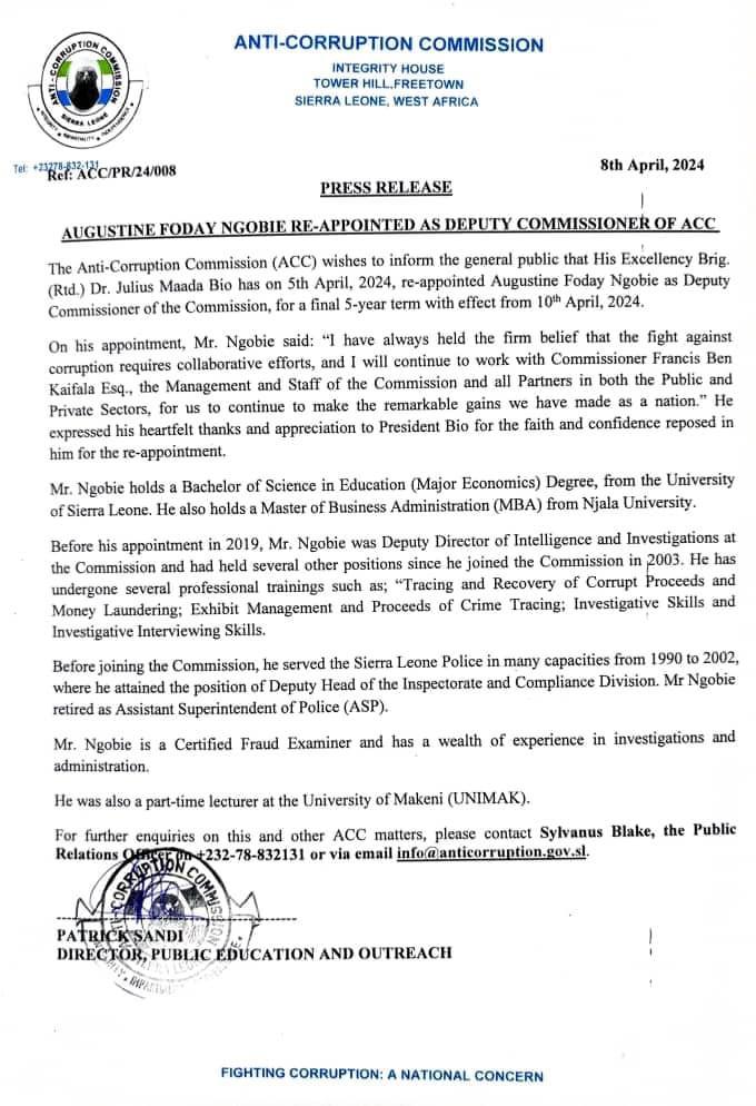 In a recent press release issued by the Anti-Corruption Commission (ACC), it has been officially announced that His Excellency Brig. (Rtd.) Dr. Julius Maada Bio has re-appointed Augustine Foday Ngobie as Deputy Commissioner of the Commission. This re-appointment comes for a final 5-year term, effective from April 10th, 2024.