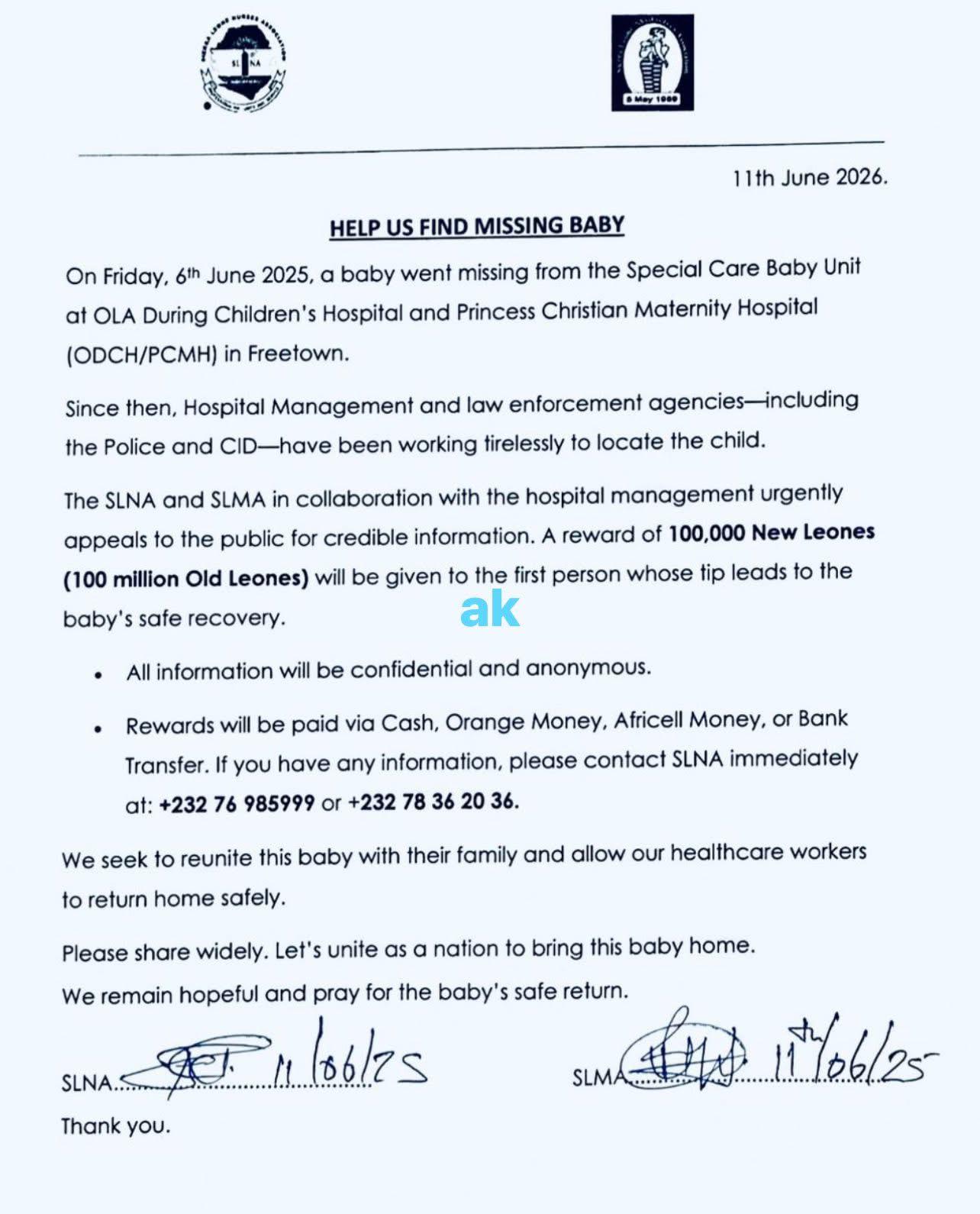 The Sierra Leone Nurses Association (SLNA) and the Sierra Leone Medical and Dental Association (SLMA), in collaboration with the hospital, have issued an appeal to the public for credible information. A reward of 100,000 New Leones (equivalent to 100 million Old Leones) will be given to the first person who provides a tip leading to the baby’s safe recovery.