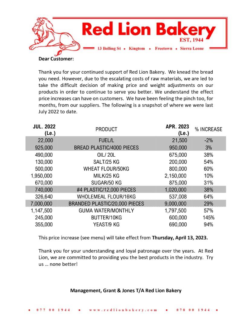 One of Sierra Leone’s popular bread producers, Red Lion Bakery, has announced an increase in bread prices.