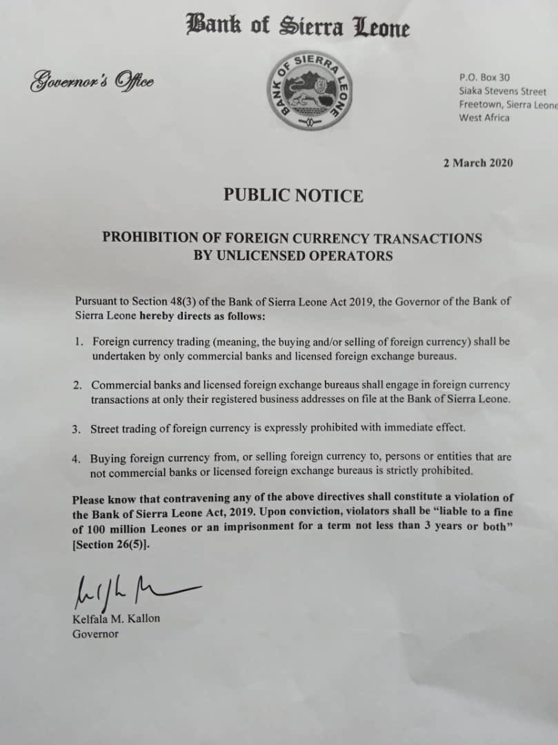 “Pursuant to section 48 (3) of the Bank of Sierra Leone Act 2019, the governor of the Bank of Sierra Leone hereby directs as follows: Foreign currency trading [meaning, the buying and /or selling of foreign currency] shall be undertaken by only commercial banks and licensed foreign exchange bureaus; Street trading of foreign currency is expressly prohibited with immediate effect,” Governor Kallon emphasized.