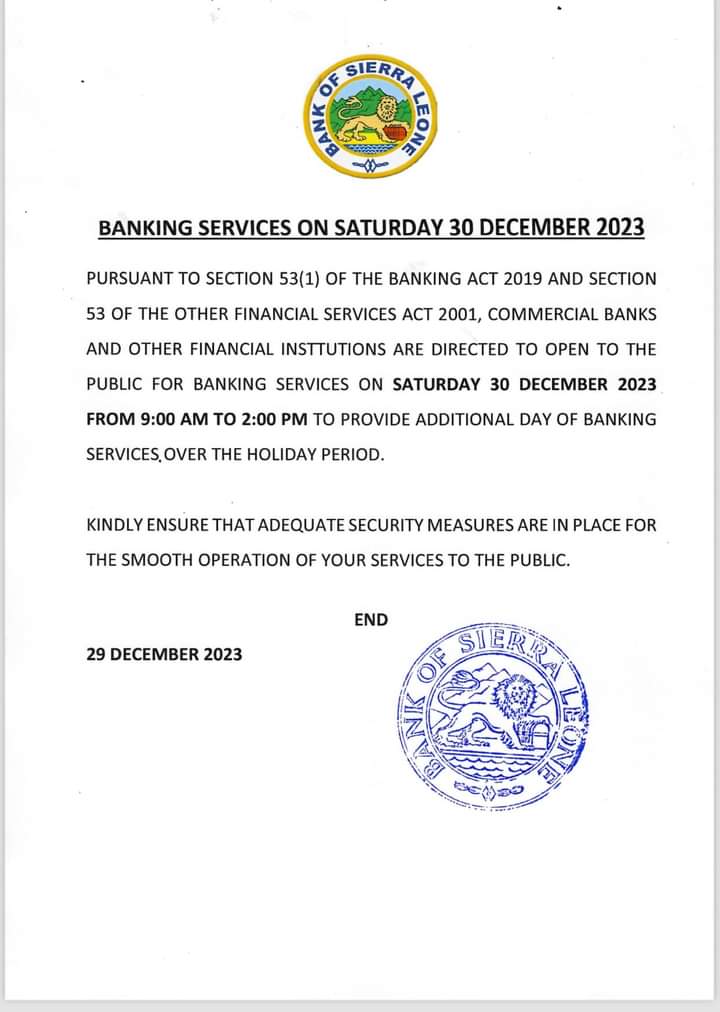 The Bank of Sierra Leone has added an extra day to the normal banking days amidst the holiday rush.