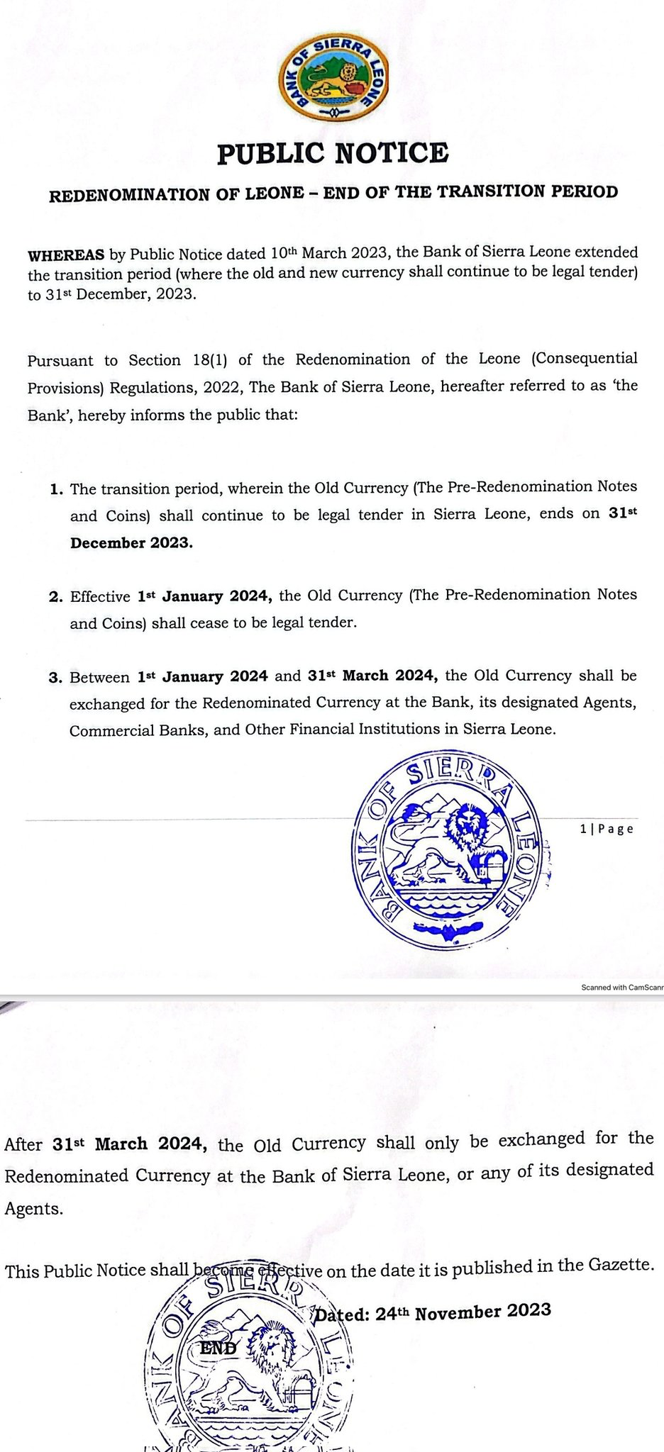 In a public notice dated November 24, 2023, the Bank of Sierra Leone officially declared the conclusion of the transition period for the coexistence of old and new currency in the country. This decision follows the extension granted in a prior notice on March 10, 2023, which pushed the transition period to December 31, 2023.