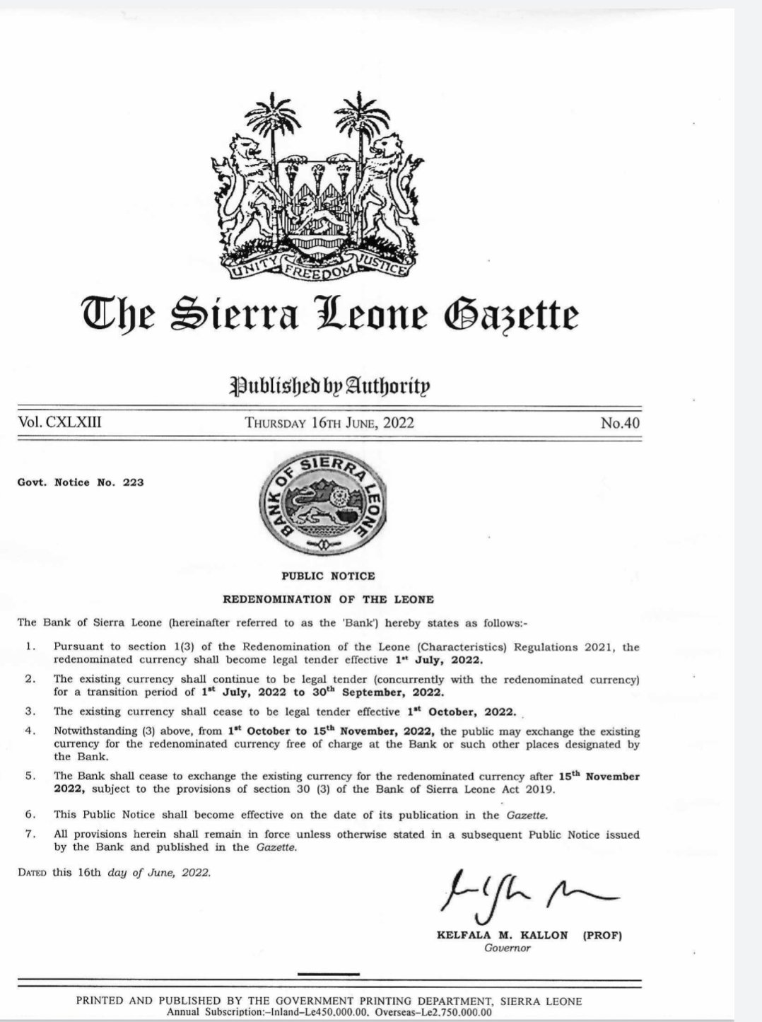 The Bank of Sierra Leone (hereinafter referred to as the ‘Bank’) hereby states as follows: 1. Pursuant to section 1(3) of the Redenomination of the Leone (Characteristics) Regulations 2021, the redenominated currency shall become legal tender effective 1″ July, 2022.