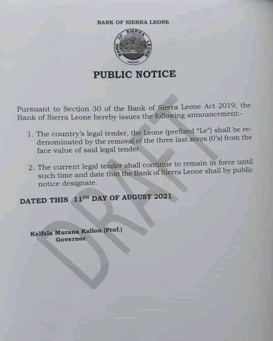 It is by dropping three zeros from the currency or moving three decimal places to the left. The name of the currency will still be the Leones. This will also see the introduction of coins For example, the following equivalents will obtain as we re-denominate: