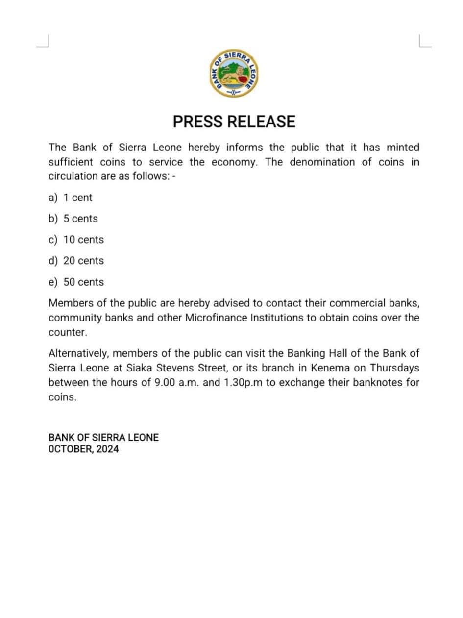 The Bank of Sierra Leone has announced that it has minted and released a sufficient quantity of coins into circulation to meet the needs of the economy.