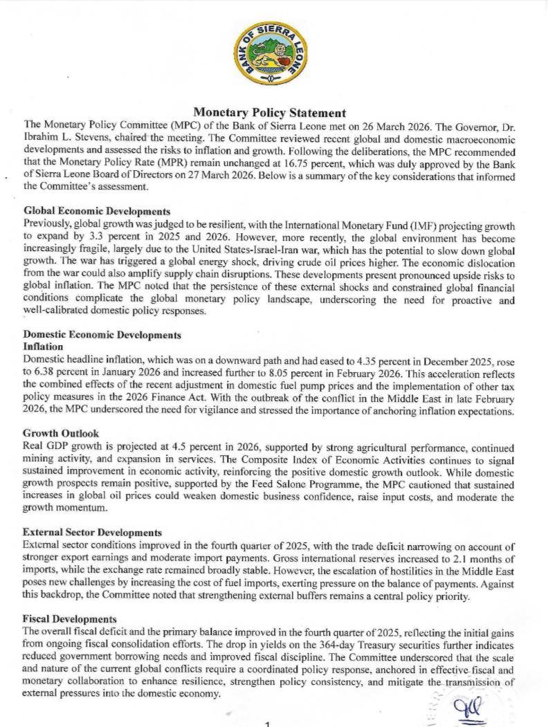 The Bank of Sierra Leone has kept its Monetary Policy Rate (MPR) unchanged at 16.75 percent, citing rising inflation and growing external risks from the ongoing United States-Israel-Iran war, while noting continued resilience in the domestic economy.