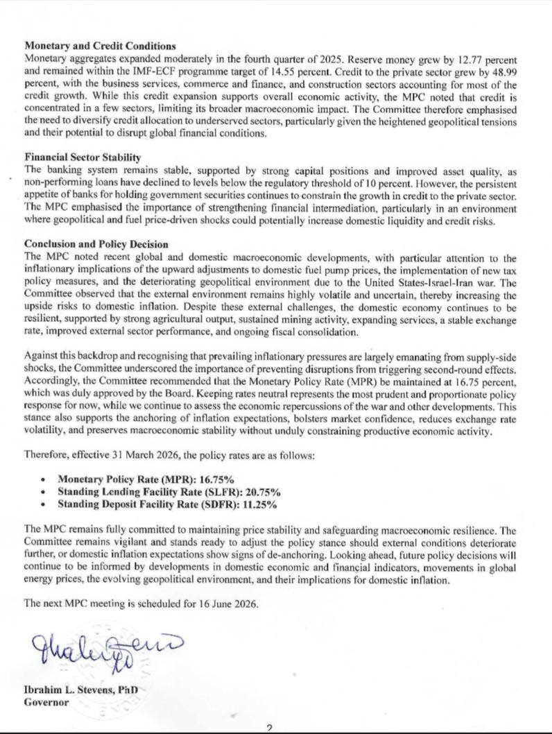 The decision, recommended by the Monetary Policy Committee (MPC) on March 26, 2026, and approved by the Bank’s Board of Directors on March 27, took effect on March 31, 2026. The MPC was chaired by Governor Dr. Ibrahim L. Stevens.