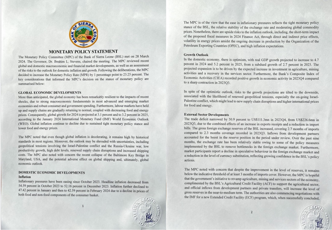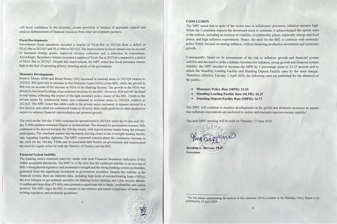 Responding to persistent inflationary pressures and uncertainties in the global economic landscape, the Monetary Policy Committee (MPC) of the Bank of Sierra Leone (BSL) has announced an increase in the Monetary Policy Rate (MPR) by 1 percentage point, bringing it to 23.25 percent.
