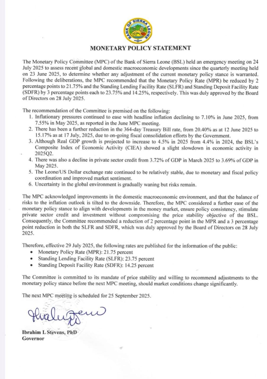 The Monetary Policy Committee (MPC) of the Bank of Sierra Leone (BSL), following its quarterly meeting on July 24, 2025, has announced a significant reduction in its key policy rates, effective July 29, 2025.