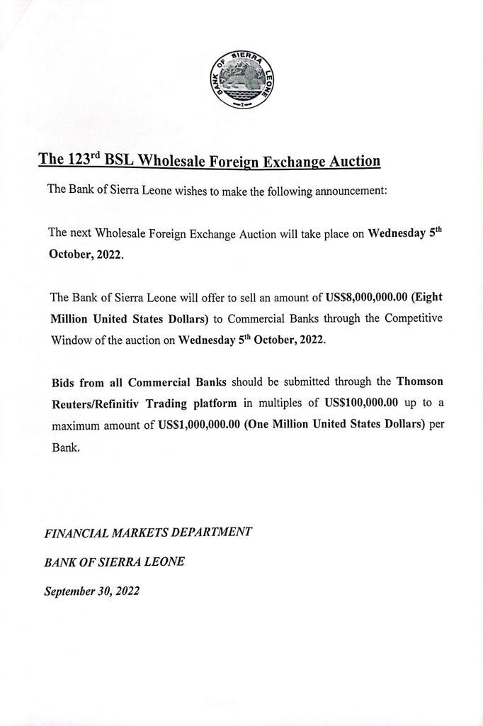 The Bank of Sierra Leone will offer to sell an amount of US$8,000,000.00 (Eight Million United States Dollars) to Commercial Banks through the Competitive Window of the auction on Wednesday 5th October, 2022.