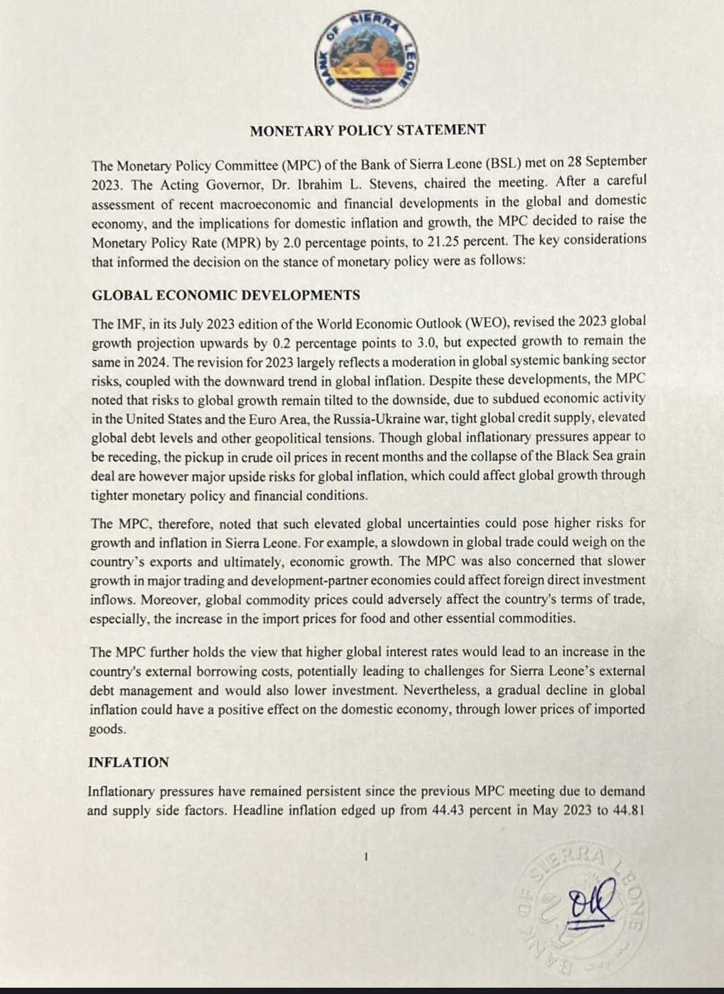 The Bank of Sierra Leone has announced a hike in the Monetary Policy Rate (MPR) by 2 percentage points, increasing it to 21.25 percent.