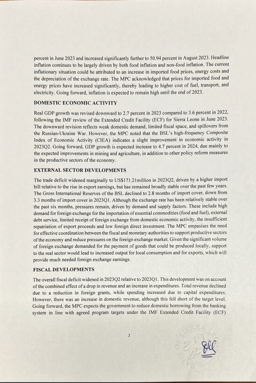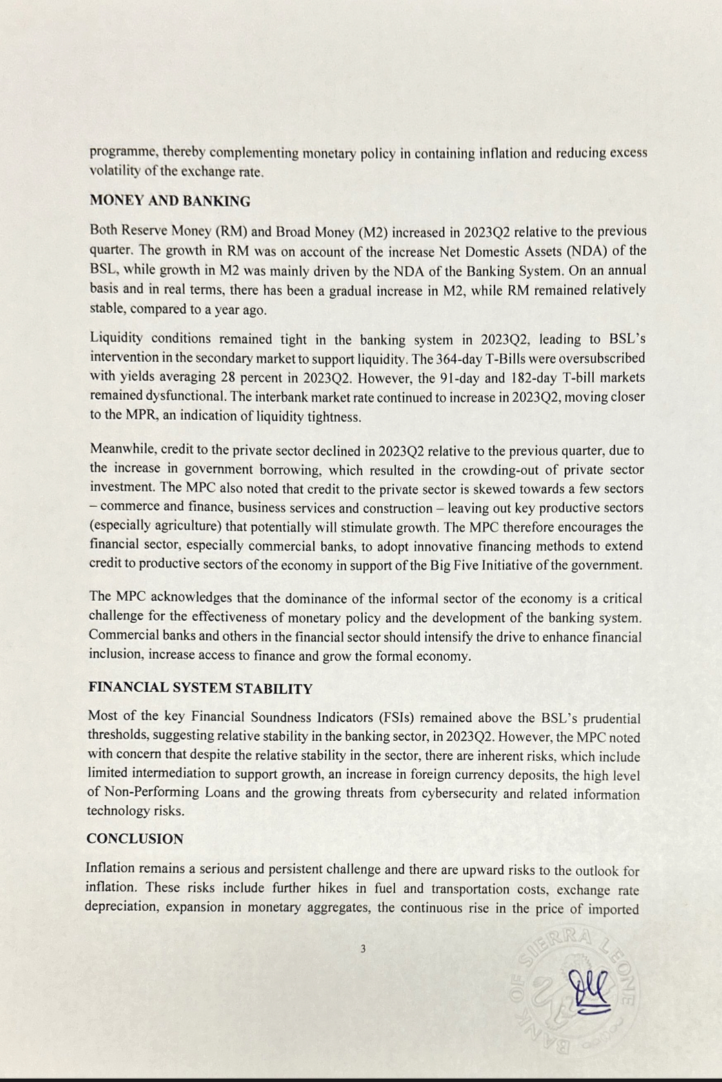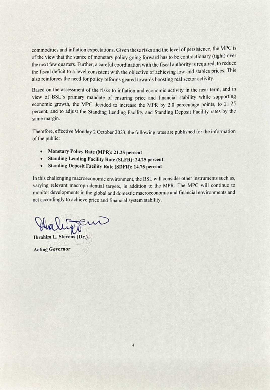 This decision was revealed in a recently published document following a meeting of its Monetary Policy Committee (MPC) on 28 September 2023. The meeting was chaired by the Acting Governor, Dr. Ibrahim L. Stevens.