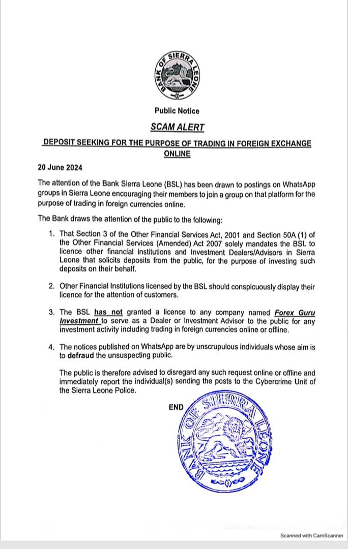 The bank of Sierra Leone has issued a public notice warning citizens against scammers.