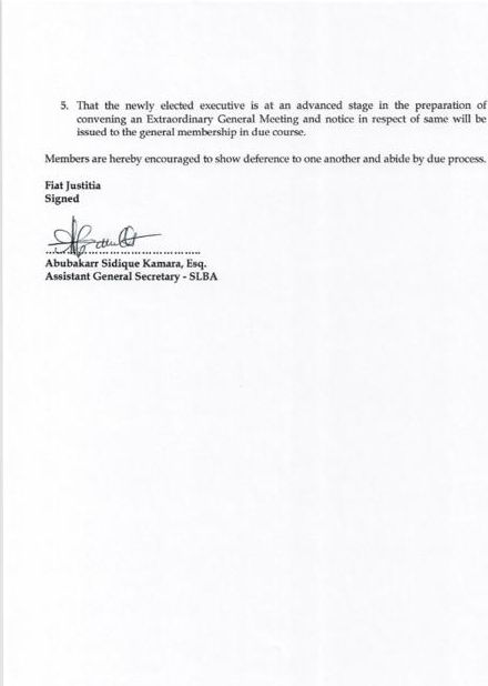 The notice also said the elections of new Directors were conducted pursuant to the Memorandum and Articles of Association of the SLBA and the Companies Act 2009 (as amended) with the following new executive Members: Tuma Adama Jabbie (Ms.) – President, Sidikie Tommy Esq. – Vice President, Alfred Paul Juwah Esq. – General Secretary, Abubakarr Sidique Kamara Esq. – Assistant General Secretary, Satto Kobba (Ms.) – Treasurer, Yoko Mahiteh Brewah (Ms.) – Assistant Treasurer and Alfred Kamanda Esq. – Public Relations Officer for the corporate years 2024 – 2026 as was announced by a public notice dated 20th May, 2024.