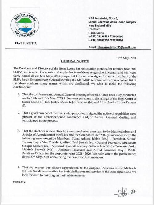 The President and Directors of the Sierra Leone Bar Association ( SLBA) has responded to a notice of requisition from Augustine S. Marrah and Wara Serry-Kamal dated 27th May, 2024, for an Extraordinary General Meeting (EGM).