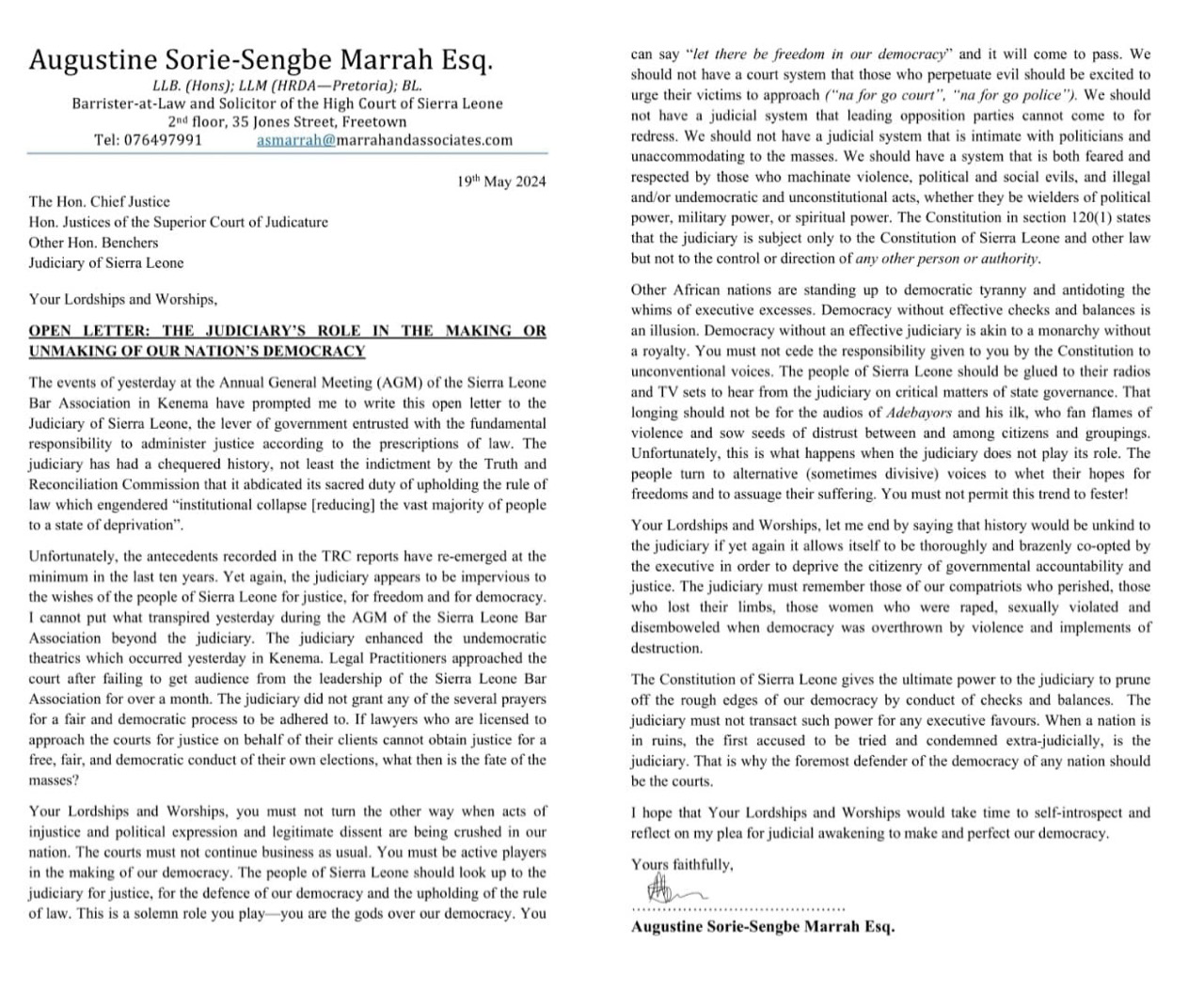 Marrah’s letter goes beyond criticism; it is a clarion call for judicial reform and active engagement in democratic governance. He implores the judiciary to not turn a blind eye to acts of injustice and suppression of dissent. He stresses that the judiciary must not continue “business as usual” but instead should be an active participant in safeguarding democracy. The people of Sierra Leone, he asserts, rely on the judiciary to protect their rights and uphold the rule of law.