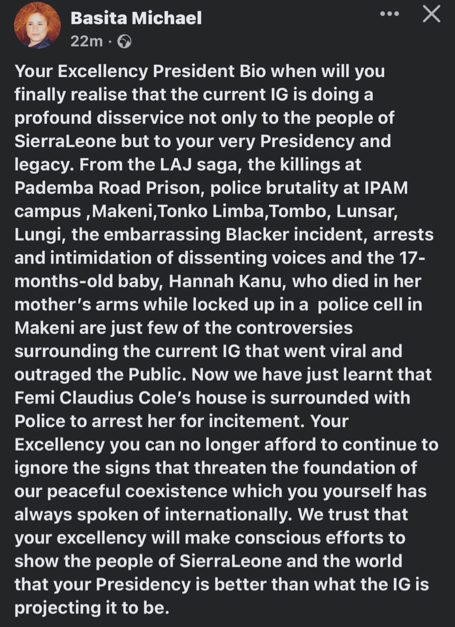 In her post Basita Michael calls on the president to show the people of Sierra Leone that his Presidency is better than what the IG is projecting it to be