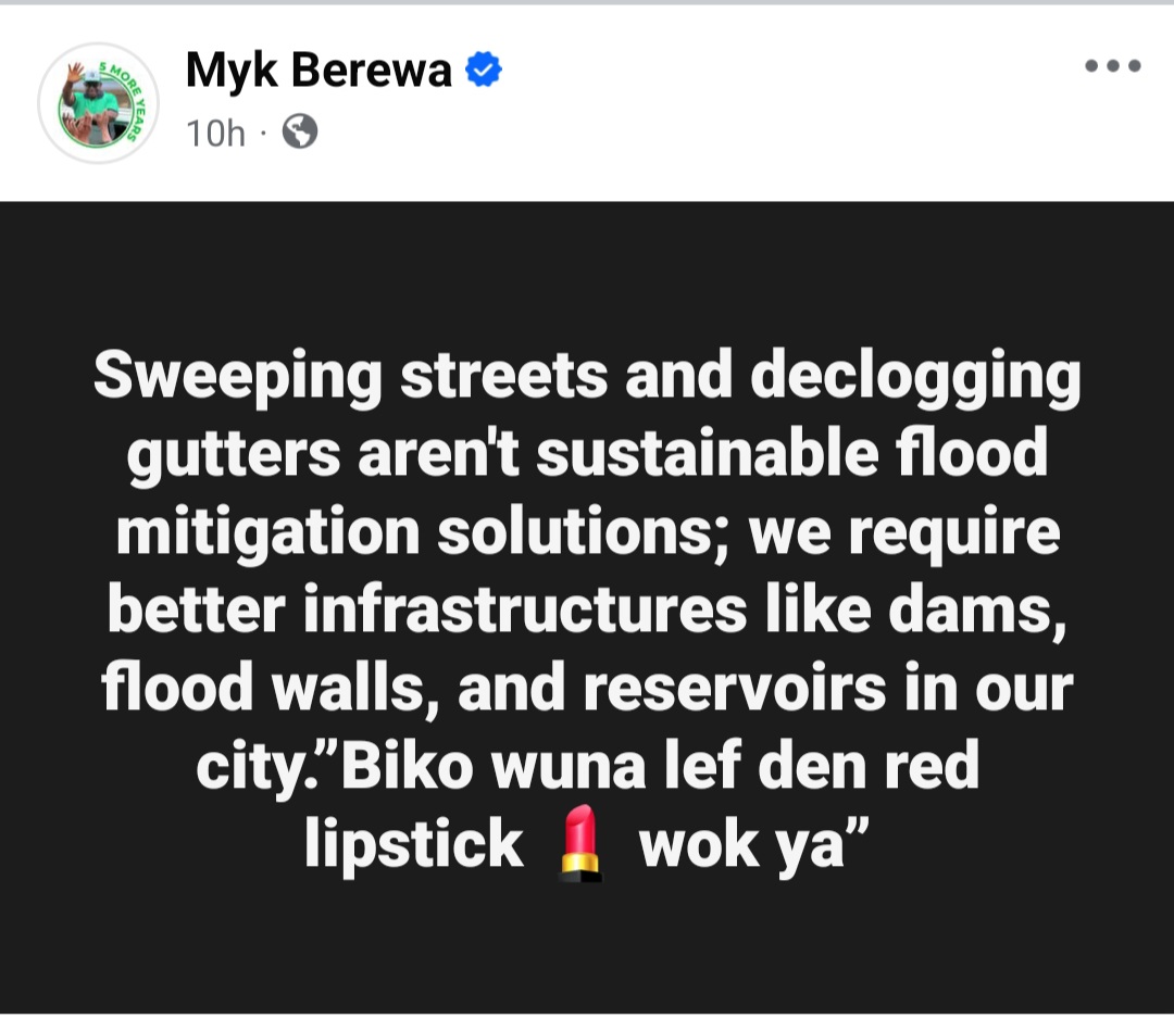 In a social media post, Berewa stated that the cleaning of gutters and sweeping of streets, while helpful, are not long-term flood solutions. He called for the construction of proper infrastructure such as dams, flood walls, and reservoirs to protect the city.