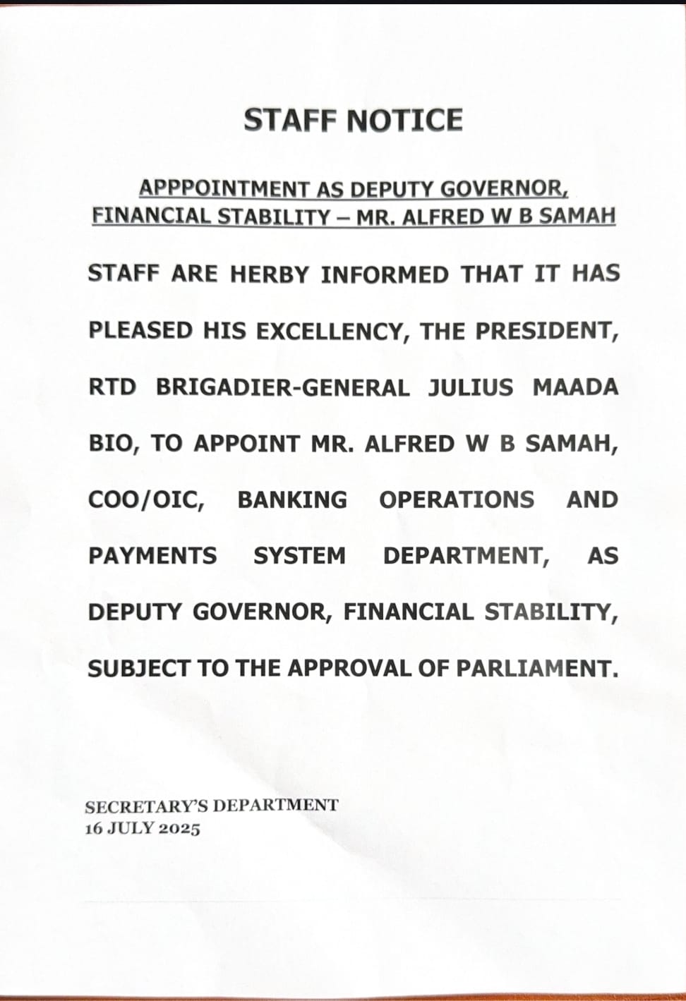 The staff notice from the Secretary’s Department of the Bank of Sierra Leone formally informed staff of the President’s decision.