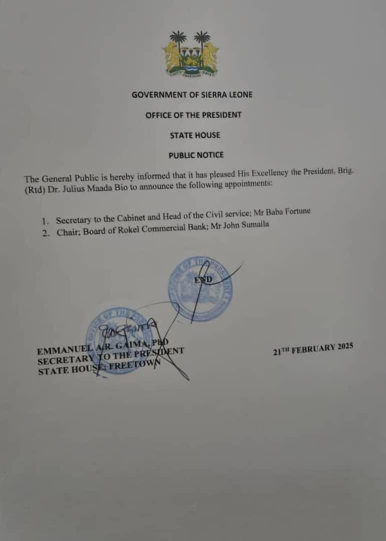 In a public notice issued by State House, the President has appointed Mr. Baba Fortune as the Secretary to the Cabinet and Head of the Civil Service. Additionally, Mr. John Sumailu has been named Chairman of the Board of Rokel Commercial Bank.