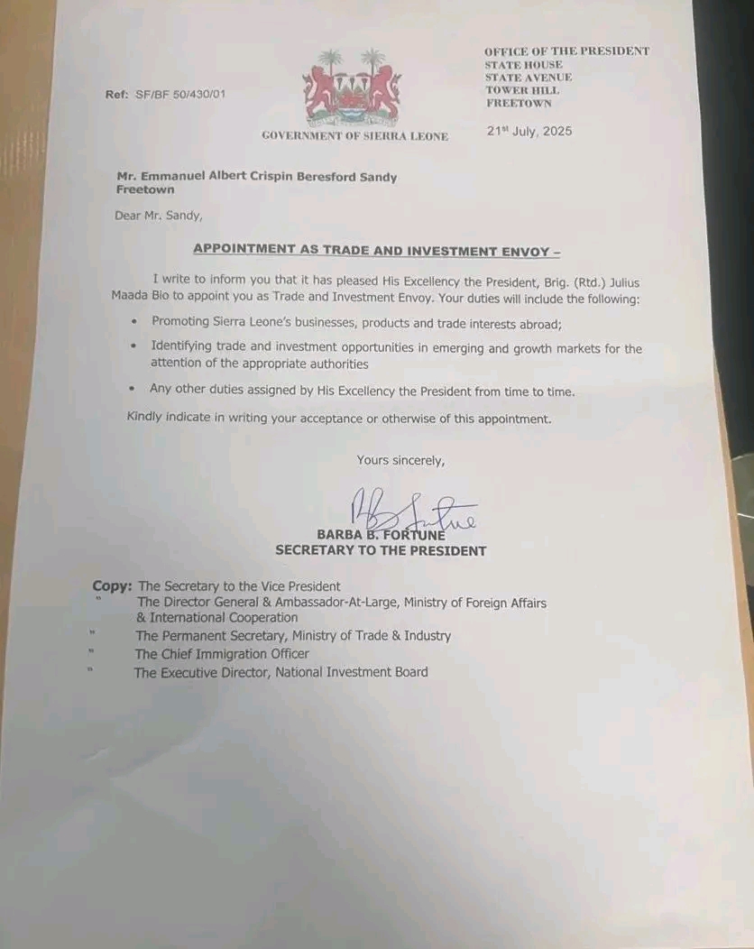 President Julius Maada Bio has appointed Emmanuel Albert Crispin Beresford Sandy as Sierra Leone’s new Trade and Investment Envoy.