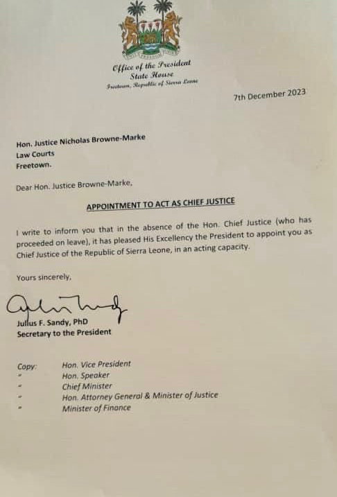 In the official Letter of Appointment issued by President Bio, he expressed, “I write to inform you that in the absence of the Hon. Chief Justice (who has proceeded on leave), it has pleased His Excellency the President to appoint you as Chief Justice of the Republic of Sierra Leone, in an acting capacity.” This move ensures that the judiciary remains fully functional and upholds its vital role in the administration of justice.