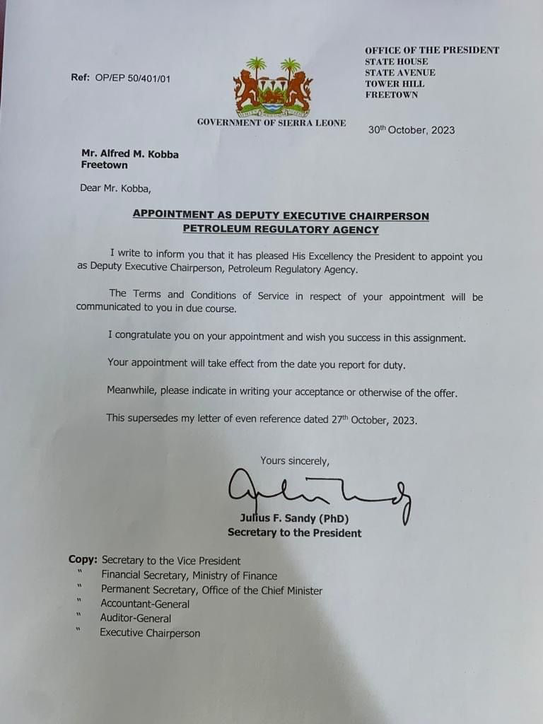 Sierra Leone’s President Julius Maada Bio has appointed Mr. Alfred M. Kobba to serve as the Deputy Executive Chairperson of the Petroleum Regulatory Agency.