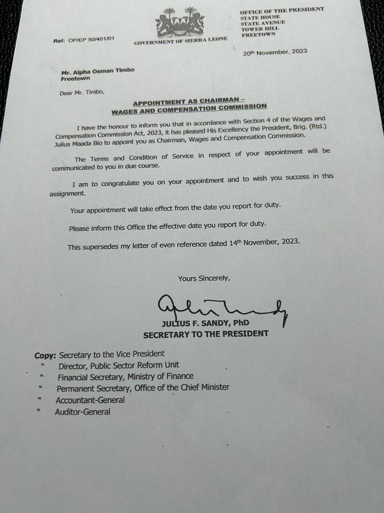 “I have the honour to inform you that in accordance with Section 4 of the Wages and Compensation Commission Act, 2023, it has pleased His Excellency the President, Brig. (Rtd.) Julius Maada Bio to appoint you as Chairman, Wages and Compensation Commission.”