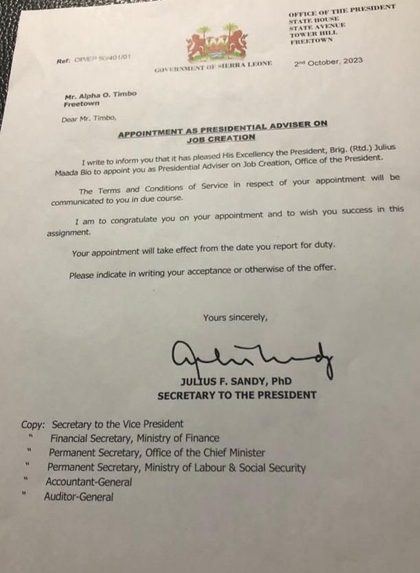 President Julius Maada Bio has appointed former Labour Minister Alpha Timbo as Presidential adviser for Job Creation, Office of the President.