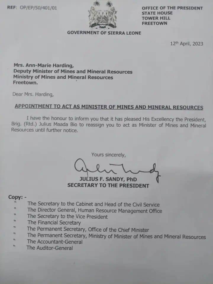 President Julius Maada Bio has appointed Ann-Marie Harding to act as the Minister of Mines and Mineral Resources.