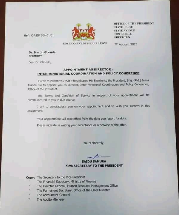 The Office of the President, situated at Tower Hill, State Avenue, Freetown, released an official letter dated 7th August, 2023, conveying the news of Dr. Gbonda’s appointment.