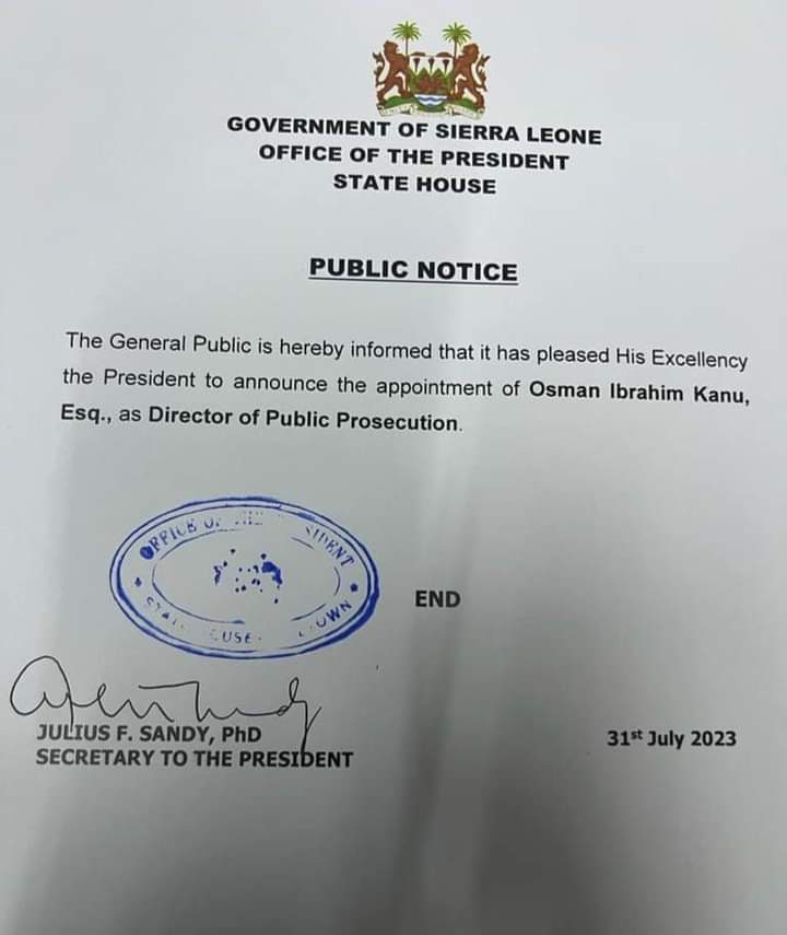 Sierra Leone’s President, Julius Maada Bio has appointed Osman Ibrahim Kanu, Esq., as the new Director of Public Prosecution.