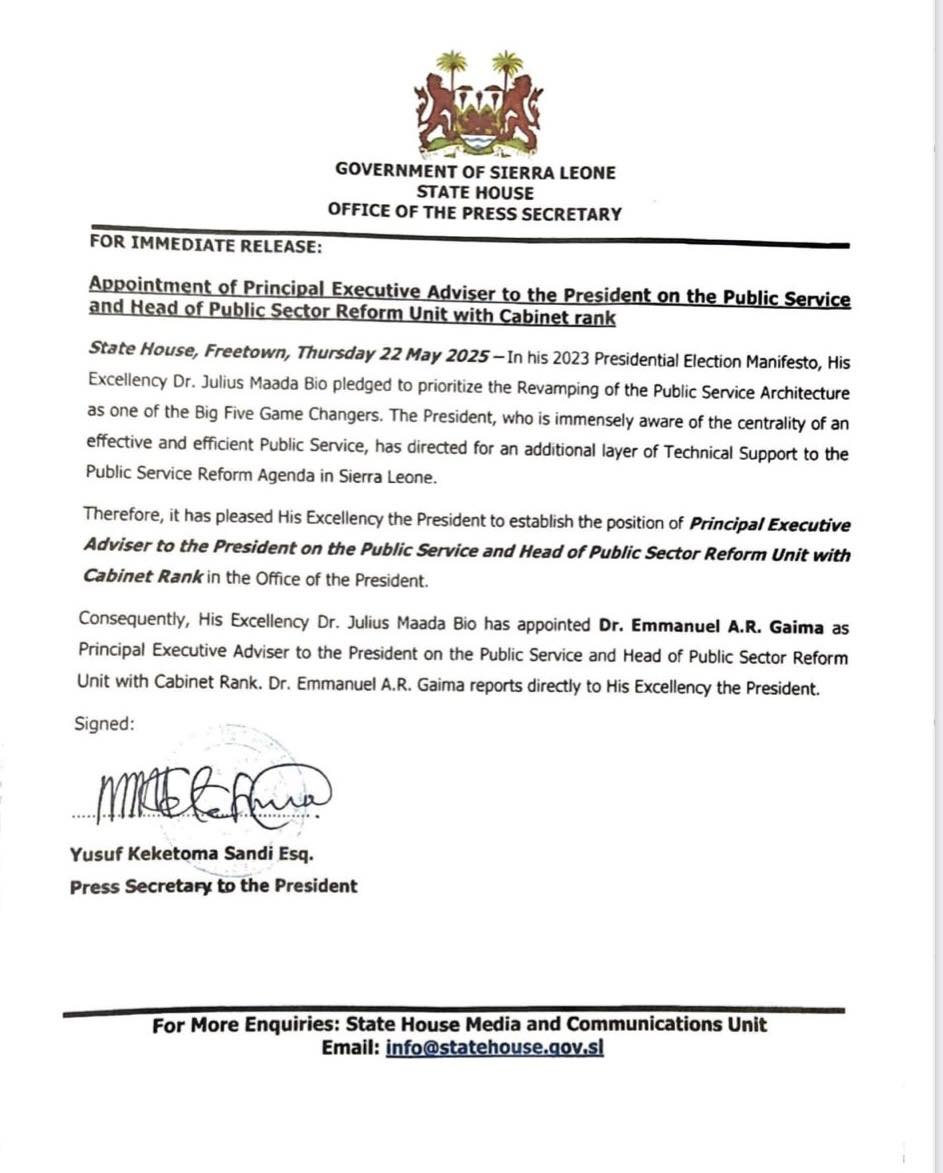 President Julius Maada Bio has appointed Dr. Emmanuel A.R. Gaima as the new Principal Executive Adviser to the President on the Public Service and Head of the Public Sector Reform Unit, with Cabinet rank.