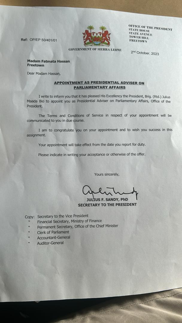 His Excellency, President Julius Maada Bio has appointed Hon. Dr Fatmata Hassan, a former member of Parliament for the Sierra Leone People’s Party (SLPP) for the Tonkolili District, who was accused of killing the Acting Editor of For Di People Newspaper.