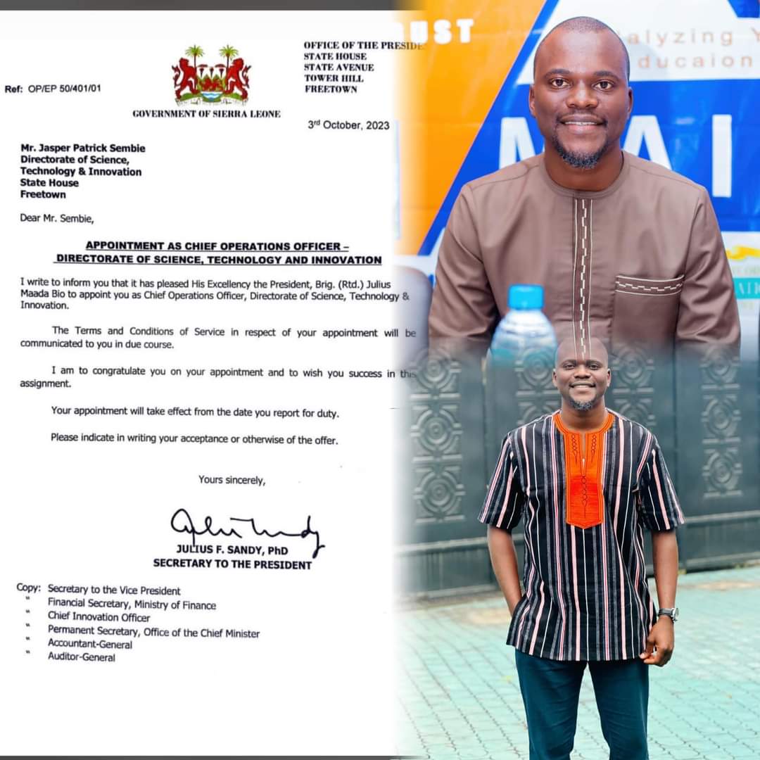 Sierra Leone’s President Julius Maada Bio has appointed Jasper Patrick Sembie as the Chief Operations Officer-Directorate of Science, Technology and Innovation (DSTI).