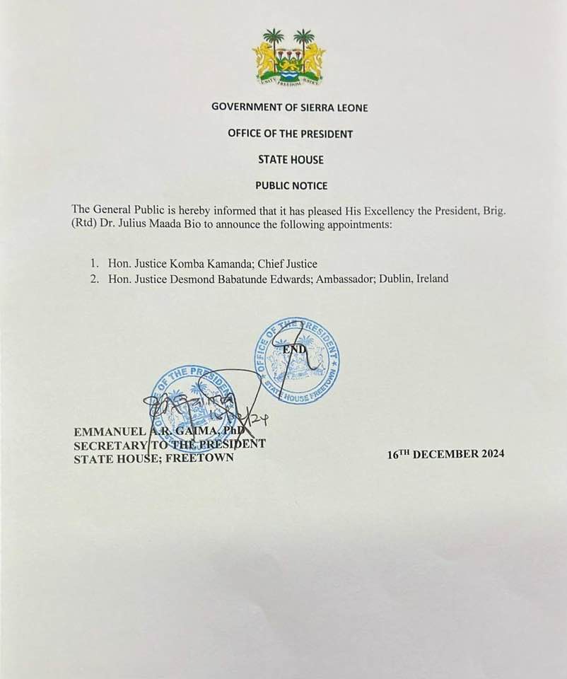 President Julius Maada Bio has appointed Justice Komba Kamanda as the new Chief Justice of Sierra Leone, following the departure of his predecessor, Chief Justice Babatunde Edwards.
