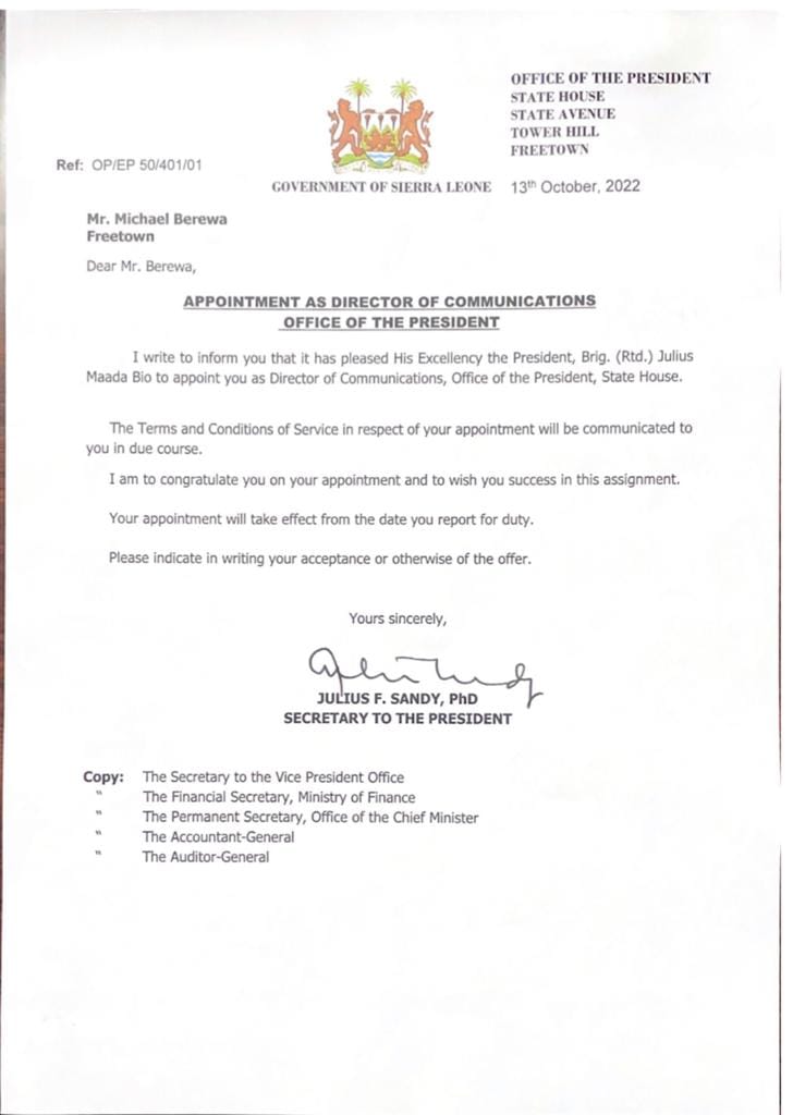 Political Commentator and Social Media Influencer, Michael Berewa has been appointed as the Director of Communications, Office of the President.