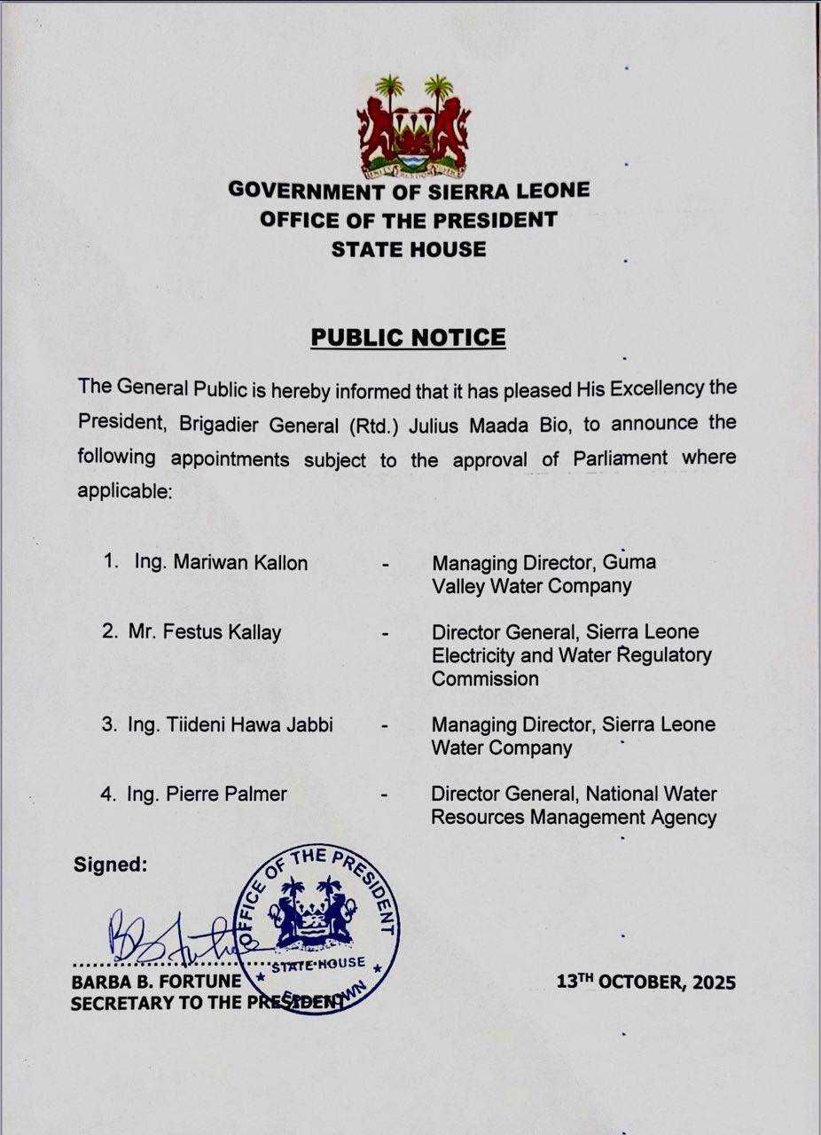 These leadership changes are expected to impact the management and regulation of Sierra Leone’s critical water resources and electricity sector.
